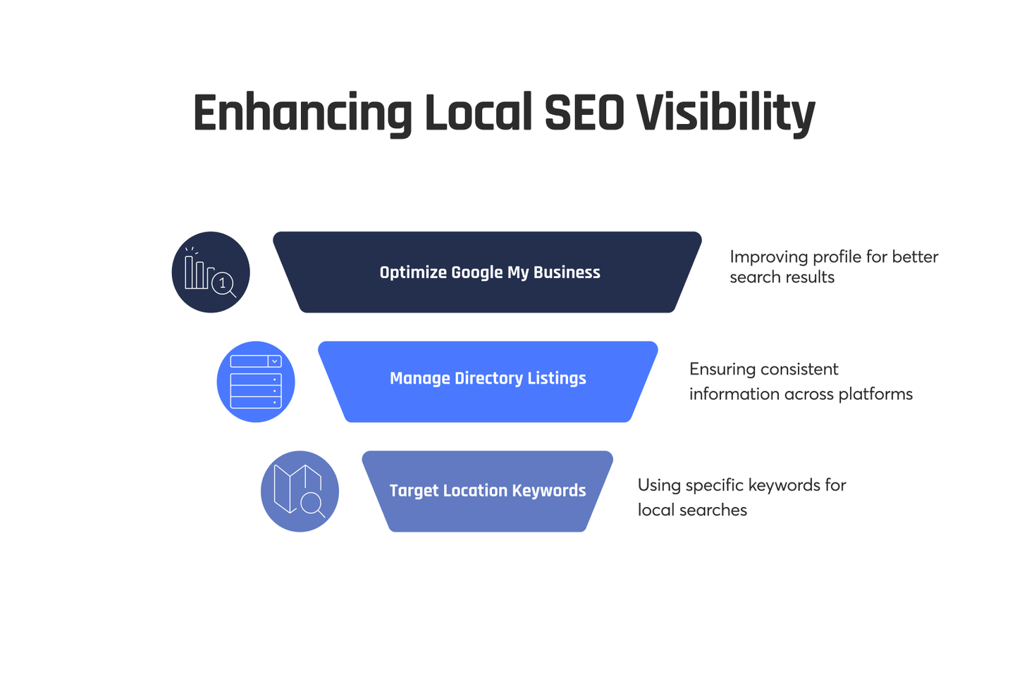 It also includes employing local SEO strategies, such as optimizing Google My Business profile and managing local business directory listings to attract clients in specific locations.