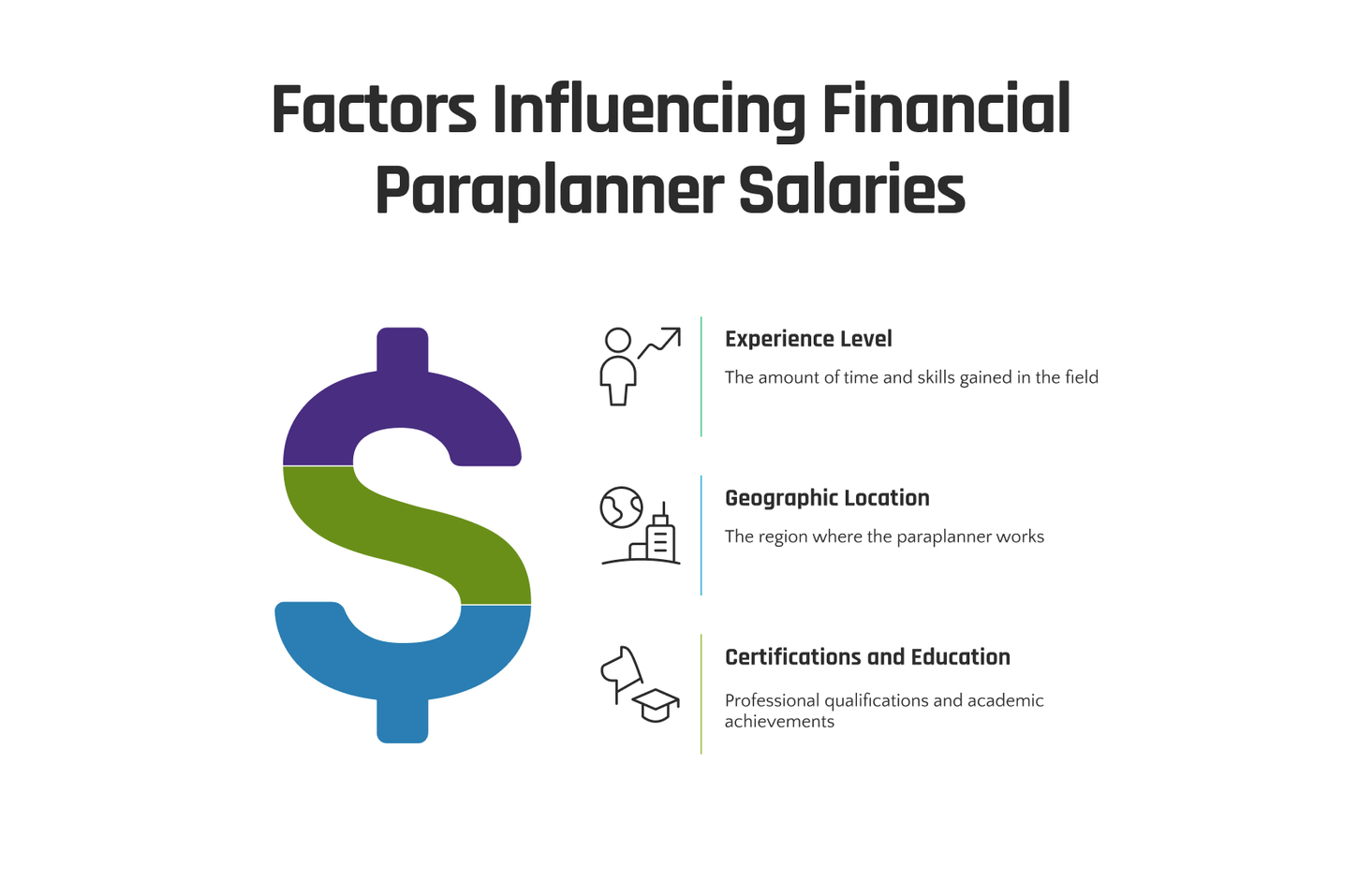 Factors affecting financial paraplanner salaries include experience level, geographic location, and certifications and education. These elements can significantly impact the earning potential in this career field.